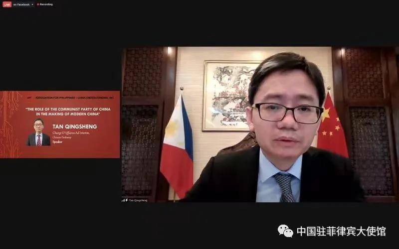 6月30日,中国驻菲律宾使馆临时代办檀勍生出席“中国共产党在中国现代化进程中的作用”线上研讨会并发表主旨讲话。会议由菲律宾中国了解协会举办,菲律宾民力党副总裁兰比诺、菲律宾政治与选举改革研究所主任卡西普勒、北京大学国际关系学院教授査道炯等参加会议并致辞。菲政、商、学、媒等各界百余人与会。