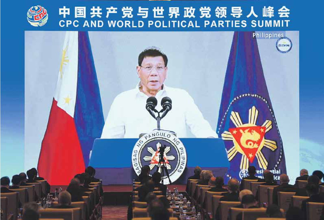 菲律宾总统杜特尔特以执政党菲民主-人民力量党主席身份,在线参加峰会发表讲话时表示,“中国已经崛起,未来几十年将在全球事务中发挥重要作用”。他呼吁与中国这个亚洲巨人进行持续的对话和和平交往,以实现互利共赢。他表示:“我们把中国当作和平与发展的朋友,我们相信伟大的中华民族的集体智慧,中国将用新的力量捍卫对全人类有益并公正的事业。”