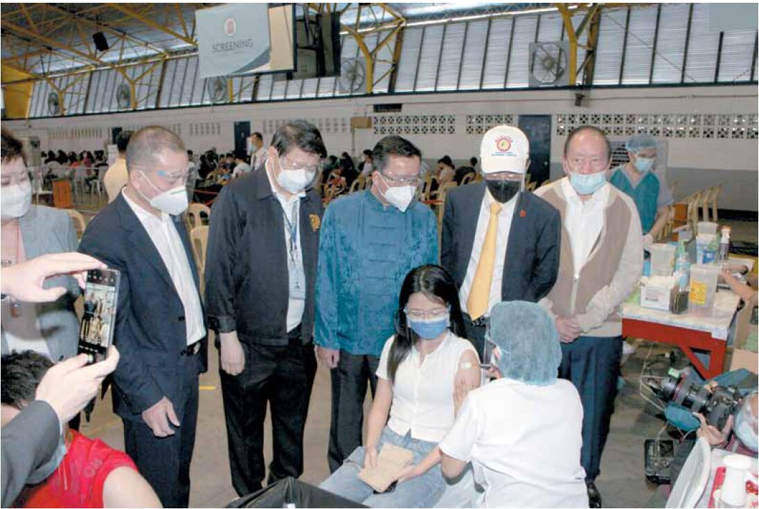 据中国驻菲律宾大使馆消息:2021年7月27日,中国驻菲律宾大使黄溪连视察菲华社抗疫委员会疫苗接种中心。黄大使详细了解“春苗行动”推进情况,与接种人员现场互动,并与抗疫委主要领导共同启动华社第二阶段疫苗接种。抗疫委林育庆总指挥、杨华鸿副总指挥、洪及祥副总指挥以及使馆王悦总领事出席活动。
